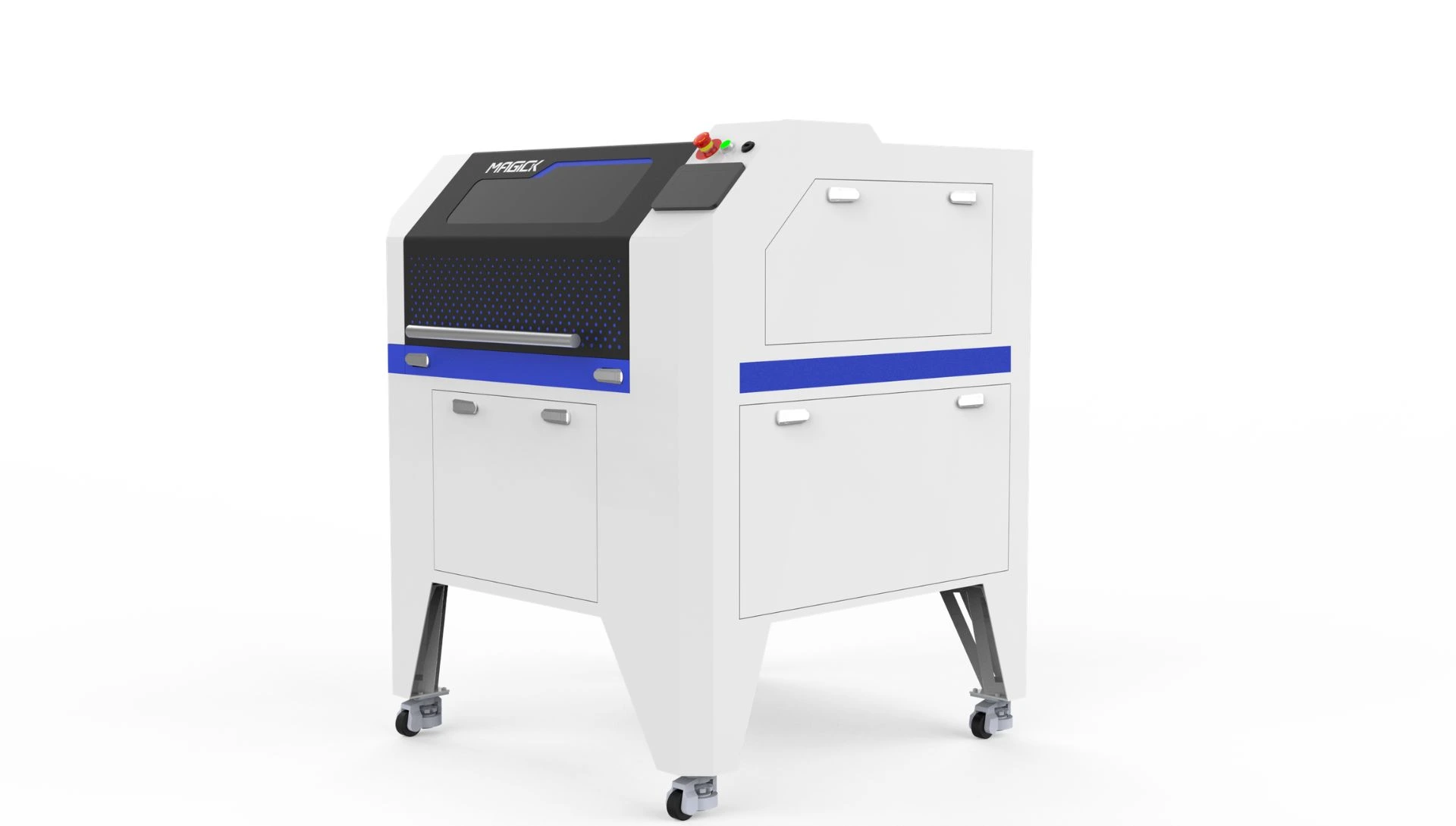 Row of fully assembled Magick laser cutting machines undergoing quality inspection on the factory floor.